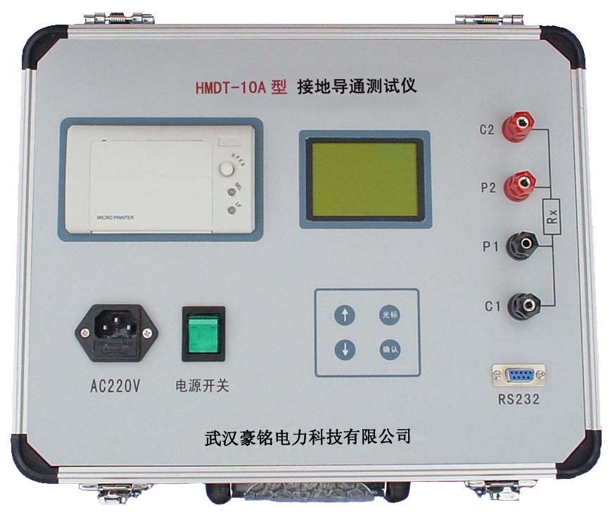 HMDT-10A型接地導通測試儀一、用途 本儀器主要用于接地裝置的電氣完整性測試,也可用于低阻值電阻的測量。二、性能特點 1、測試精度高,優于相關規程要求。 2、具備斷線報警功能,避免了錯誤測量。 3、可保存50組測量數據,且自帶微型打印機可現場打印測量結果。 4、操作簡單。全中文菜單式操作,直接顯示出測量結果。 5、本儀器體積小、重量輕,方便攜帶。三、技術指標測試電流 1A、2A、5A、10A 備注最大輸出電壓 24V 量 程 1A檔:20Ω 2A檔: 10Ω 5A檔: 4Ω 10A檔: 2Ω 最高分辨率 0.01mΩ 測量誤差 10A檔:+(讀數×0.2%+0.1mΩ) 5A檔:+(讀數×0.2%+0.1mΩ) 2A檔:+(讀數×0.2%+1mΩ) 1A檔:+(讀數×0.2%+1mΩ) 工作電源 AC220+15%,50Hz 工作環境 溫 度:0—40℃ 相對濕度:≤90% 體 積 340mm×300mm×210mm 重 量 5.5kg