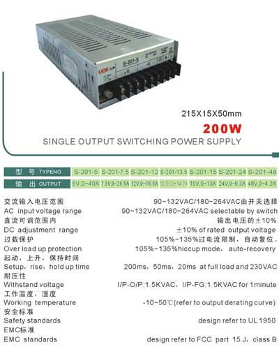 開關電源(單組電壓輸出)S-201-5(輸出電壓5V,40A);S-201-12(輸出電壓12V,16.8A);S-201-24(輸出電壓24V,8.5A)。