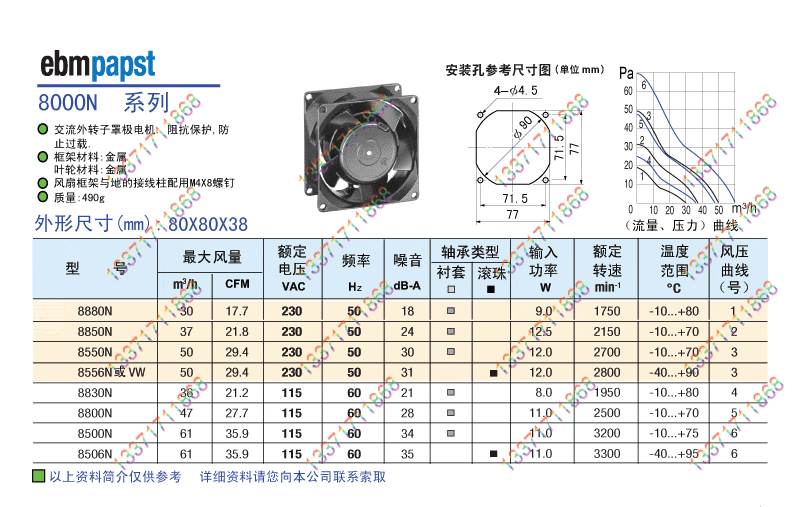 供應(工程尾貨)德國 ebmpapst 8556N或VW鐵扇葉230V交流軸流風扇,外形尺寸:80X80X38(mm)