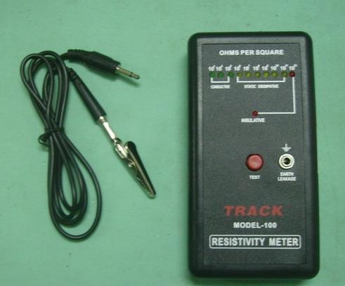 MODEL-100表面電阻測試儀提供簡易量測導電,靜電消散及絕緣表面,平行檢測條,遵循ASTM標準D-257測試方法,只需放置在要測物表面及按下紅色按鍵,儀器上的十個指示燈103Ω至<10V-1012Ω或絕緣LED將其中一個根據測試數值亮起。 注:儀此儀器不能測試表面阻值超過1013Ω的物體。 137(L)*76(W)*30(D)MM