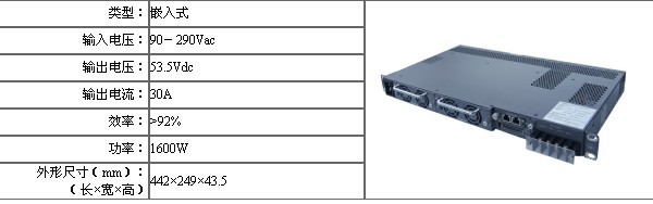 | X029A | 90 - 290 Vac | 53.5 Vdc | 30 A | 1600 W | >92 % | 442×249×43.5 |
