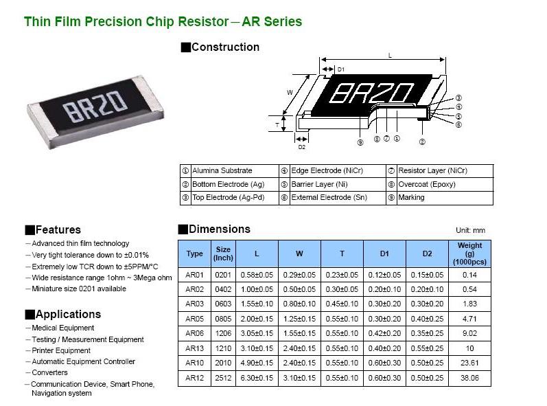 尺寸封裝: (0201;0402;0603; 0805;1206;1210;2010;2512可選)