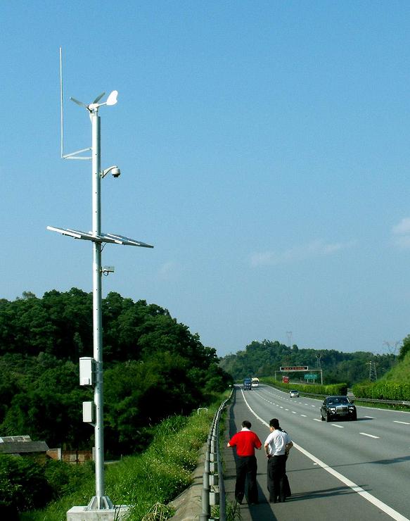 風光互補供電的高速公路全程監控系統由太陽能電池陣列、風力發電機、蓄電池組、風光互補充放電控制器、逆變器、變壓器、攝像機和光端機等設備組成。