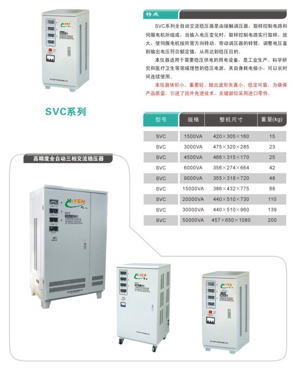 惠元穩壓器SVC-50K技術曝光SVC系列高精度全自動單相穩壓器由接觸式自耦調壓器、伺服式電動機、自動控制電路等組成,當電網電壓不穩定或負載變化時,自動采樣控制電路發出信號驅動伺服電機,調整自耦調壓器碳刷的位置,使輸出電壓調整到額定值并達到穩壓狀態。本產品具有穩壓精度高、效率高、損耗小、波形不失真等特點,設有延時、過壓、過流、欠壓等保護功能,可長期連續工作。