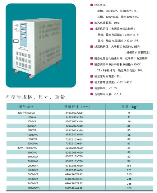 SJW系列產品全部采用三星分別調壓,具有三相電壓自動平穩衡功能;2.穩壓范圍均為三相380V±20%(304V-456V),單相220V±20%(176V-264V)如需更寬穩壓范圍可根據用戶要求制作;穩壓精度±2。3.輸出電壓電流顯示為LCD液晶顯示,同調和分調任意設置,可以設置穩壓故障不間斷轉市電。4.該產品具備CE SONCAP廣電入網認證,變壓器采用全銅線制作,含銅量99.94%