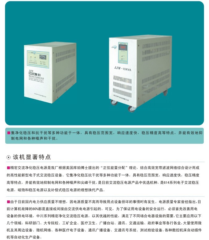 河南音響穩壓器JJW/JSW隔離消噪音純在線河南中川總部JJW/JSW/SJW系列產品全部采用三星分別調壓,隔離加強型、隔離凈化型、普通凈化型、具有三相電壓自動平穩衡功能;2.穩壓范圍均為三相380V±20%(304V-456V),單相220V±20%(176V-264V)如需更寬穩壓范圍可根據用戶要求制作;穩壓精度±2。3.輸出電壓電流顯示為LCD液晶顯示,同調和分調任意設置,可以設置穩壓故障不間斷轉市電。4.該產品具備CE SONCAP廣電入網認證,變壓器采用全銅線制作,含銅量99.94%,一個專業、專注、專長服務于一體的鄭州宏瑞德電氣設備有限公司宏瑞德電氣設備有限公司在國內電源產品及技術解決方案等領域占據領先地位,公司產品已達到國內、國際同類產品的領先水平。宏瑞德公司與美國知名的電源廠商合作研發生產的大型EPS/UPS,單機最大容量800KVA,輸出功率因素0.9,具備自老化功能,市電同步采用快切方式供電,大大提高電子元件使用壽命,同時可實現6臺UPS冗余并機。實現了用戶效益最大化,填補了國內大型高端EPS/UPS的空缺。