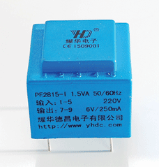 特點:真空環氧灌封 阻燃特性符合UL94-VO 安裝方式:電路板焊接 基本指標:初級工作電壓:220V(或按用戶要求如:110V/230V/380V/400V) 輸出:單雙6V,9V 工作頻率:50/60HZ 功率:2VA 認證:CE ROHS CQC 外形尺寸:31.5*28*28 針腳數:10個