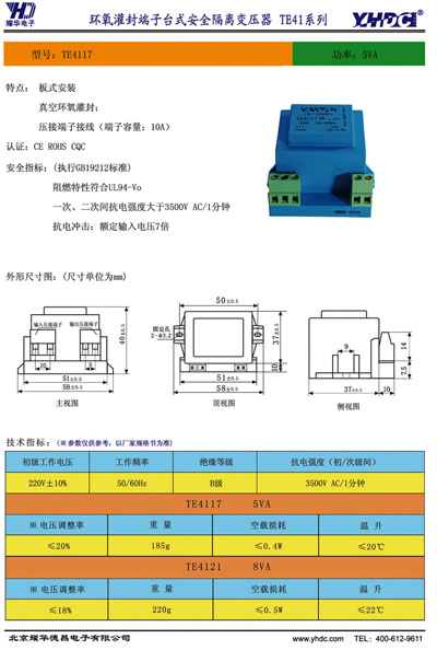 特點;板式安裝 真空環氧灌封 壓接端子接線(端子容量:10A)認證:CE ROHS CQC安全指標:(執行GB19212標準) 阻燃特性符合UL94-VO 一次、二次間抗電強度大于3500V AC/1分鐘 抗電沖擊:額定輸入電壓7倍