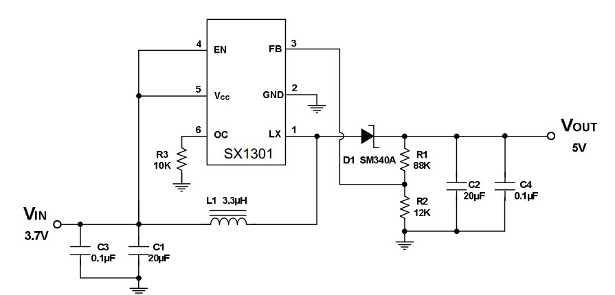 SX1301是一款小封裝(SOT23-6)、CC(恒流)模式的PWM升壓IC,適用于鋰電池(3~4.2V)輸出5V,1A的移動電源應用。SX1301輸入電壓范圍可由最低2.6伏特到最高6伏特,輸出電壓3.3--20V可調整且內部MOS輸出開關電流可高達2A,封裝為SOT23-6,工作頻率為1MHZ,可以搭配3.3uh小型貼片電感,減少成品體積,非常適合于數碼便攜產品電池供電,3G網絡產品,數碼相機,LCD液晶屏背光電路,太陽能照明路燈,網絡通訊等產品的電壓轉換。