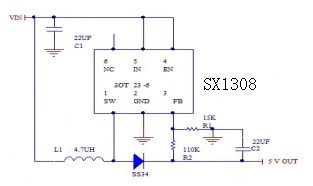 SX1308采用標準的SOt-23-6無鉛封裝,現以開始大批量供貨。