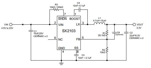 SX2103是一款單片同步整流降壓穩(wěn)壓器,它集成了導(dǎo)通阻抗130毫歐的MOSFET,可以很寬的輸入電壓范圍(4.75V-23V)內(nèi)提供3A的負(fù)載能力。電流模式控制使其具有很好的瞬態(tài)響應(yīng)和單周期內(nèi)的限流功能?烧{(diào)的軟啟動時間能避免開啟瞬間的沖擊電流,在待機(jī)模式下,輸入電流小于1uA。SX2103封裝為SOP-8, 同時提供了緊湊的系統(tǒng)方案,可以最大限度的減少外圍元件。