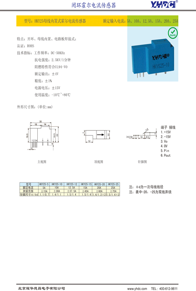 HKY25母線內置式霍爾電流傳感器 額定輸入電流:5A/10A/12.5A/15A/20A/25A
