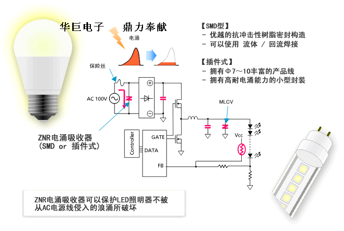 隨著LED顆粒成本的不斷降低,越來越多的LED燈具走入尋常百姓家,但是工頻用電網絡難免受到雷電及工業大功率器件啟動和停止的影響,是的供電網絡電壓波動,從而引起LED的損壞,嚴重影響LED的使用壽命。使用華巨電子生產的具有過壓保護功能的壓敏電阻將是一個很好地低成本解決方案,華巨電子以其在壓敏電阻保護領域的經驗推薦客戶選用我的壓敏電阻作為LED浪涌防護,防止LED被AC輸入端侵入的浪涌電流所破壞,考慮到現在LED燈具照明體積越來越小,越來越扁平化,華巨電子適時推出適合專門應用于LED照明的大尺寸貼片壓敏電阻。