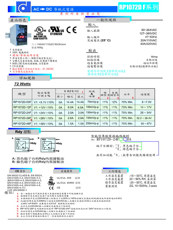 RP1072D-24F , 24V3A數顯導軌電源性能參數1.內置短路、過流、過熱保護