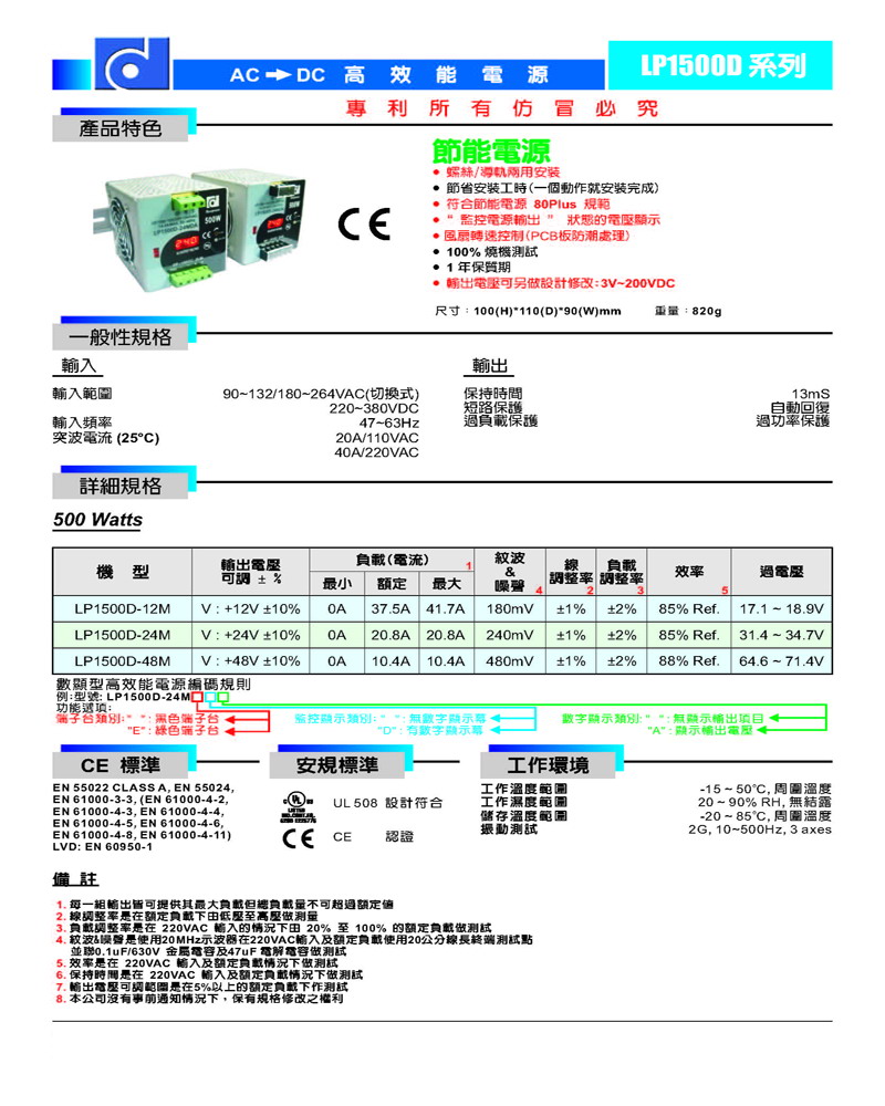 LP1500D-24MDA,24V20A數(shù)顯導軌式開關電源性能參數(shù)