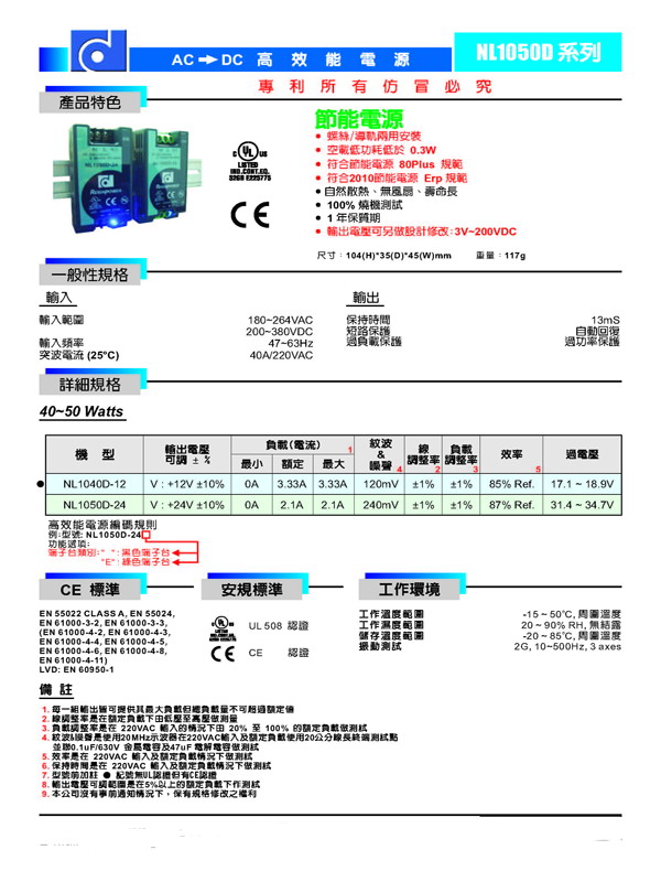 NL1050D-24,24V2A導軌式開關電源性能參數