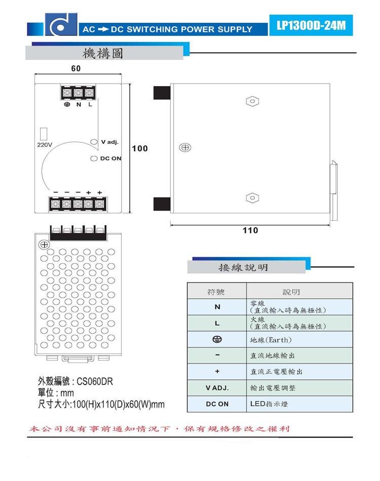 2.輸入電壓:100/220V AC(切換式電壓)