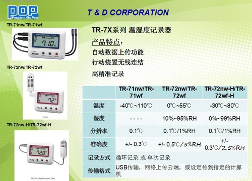 T&D CORPORATION TR-7X系列 溫濕度記錄器產品特點:自動數據上傳功能行動裝置無線連結高精準記錄