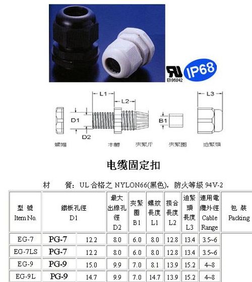 材質(zhì):UL 尼龍66,防火等級94V-2,夾緊圈為耐油橡膠材質(zhì)