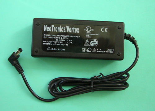 1.基本資料:品牌:NeoTronics/Vertex,型號:ACMD-06,內徑:2.5mm,外徑5.5±0.1mm.電源線長度:1800mm±10mm,外形尺寸:100×42×28(mm),本產品圖片為實物拍攝,安規認證:UL,FCC,CE,TVU,CUL,CCC,EK,PSE,CSA,GS,VDE,集合或部分認證等,桌上型,單電壓。