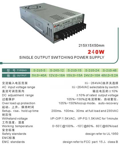 開關(guān)電源(單組電壓輸出)S-240-5(輸出電壓5V,40A);S-240-12(輸出電壓12V,20A);S-240-24(輸出電壓24V,10A)。