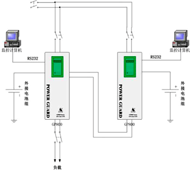 針對更高可靠性的環(huán)境應(yīng)用,還可以采用下面的串聯(lián)熱備份結(jié)構(gòu)配置,這種配置方案采用兩臺同容量的GP800 UPS主機,具體應(yīng)用時將一臺主機串聯(lián)在另一臺UPS主機的旁路上,從而保證任何一臺主機發(fā)生故障時,都有一臺正常的UPS主機為負(fù)載設(shè)備提供穩(wěn)定、干凈的電源: